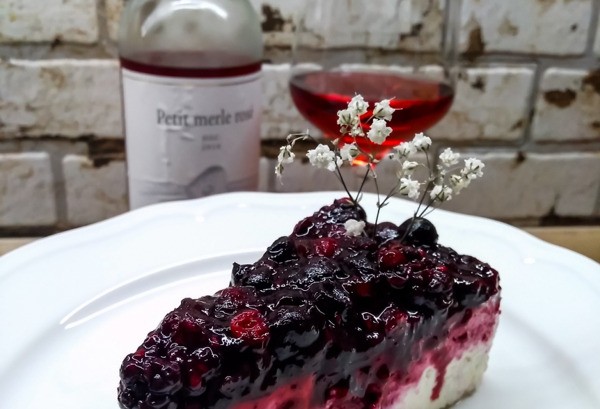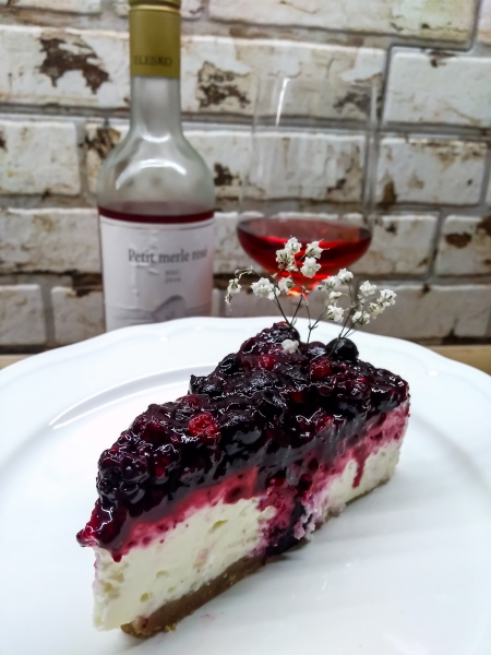 ↓Cheescake s lesným ovocím v kombinácii s neodolateľným ELESKO Petit Merle Rosé. Chuť vína podčiarkne svojou ovocnosťou a sviežosťou lahodný koláč.