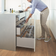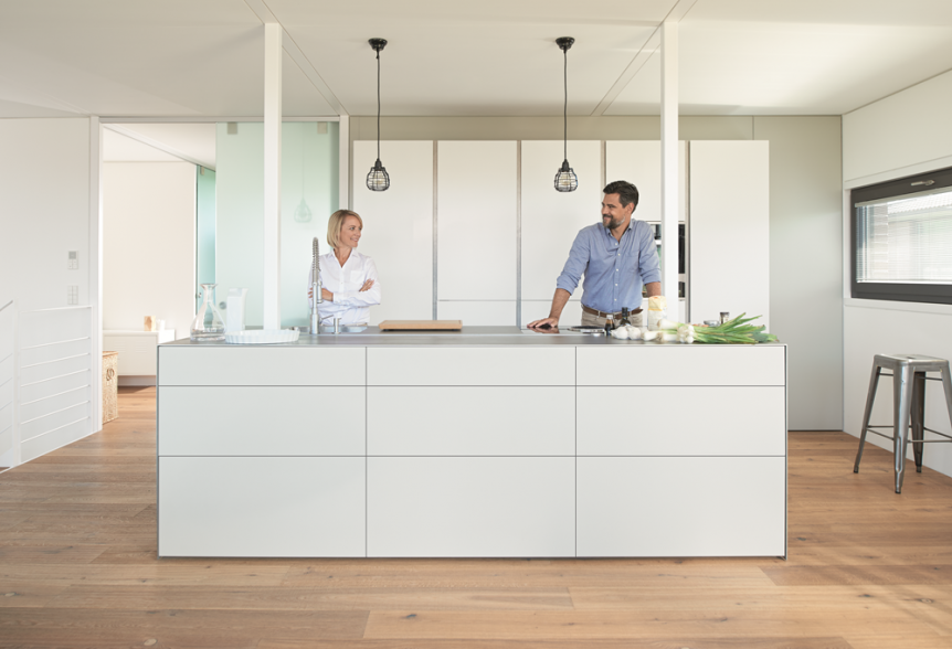 Elektrická podpora pohybu sa používa v celej kuchyni a ideálne podporuje módny vzhľad. Aj v prípade extra širokých výsuvov, ktoré bez problémov unesú dokonca aj plné prepravky s nápojmi. Pár bol tak nadšený touto novou slobodou pohybu, že si následne vybavil kuchyňu aj s chladničkou s riešením bez úchytiek SERVO-DRIVE flex. Pomocou prídavného vypínača možno SERVO-DRIVE podľa potreby aj vypnúť – čo je ideálne pri čistení.