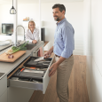 Štíhly, strohý dizajn zásuviek LEGRABOX z antikoru s povrchovou úpravou chrániacou pred odtlačkami prstov významne prispieva k vydarenej symbióze estetiky a funkčnosti dovedenej do posledného detailu. Ako aj súvisiaci systém vnútorného delenia AMBIA-LINE, ktorý splnil obom sen o elegantnej, dizajnovej a predovšetkým funkčnej kuchyni.