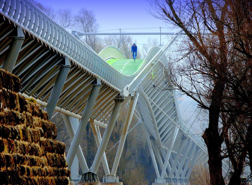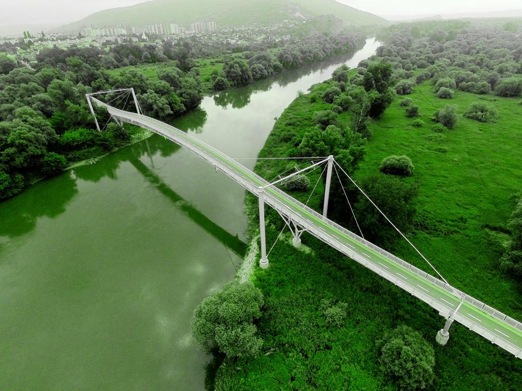 „Architektonické riešenie je výsledkom hľadania efektívneho tvaru, bio-dizajnu a symetrickej úspornej konštrukcie s veľkým rozponom nad riekou a malým rozponom nad inundáciou.“ - Milan Beláček